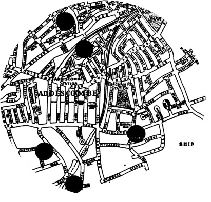 Map showing where V1 flying bombs landed in Croydon. Beneath is an enlargement of the central area of the map - the factory is near the top and Geoff's house near the bottom.