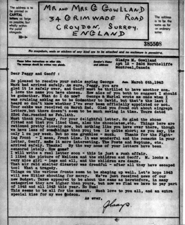 Airgraph dated 6th March 1943 - Note original size is 4.3/4" x 4.1/4" - 12cm x 11cm