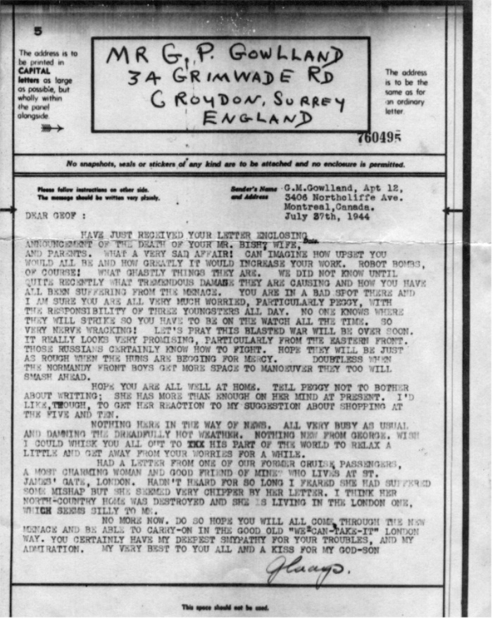Airgraph No 760495 dated 27th July 1944 - Note original size is 4.3/4" x 4.1/4" - 12cm x 11cm