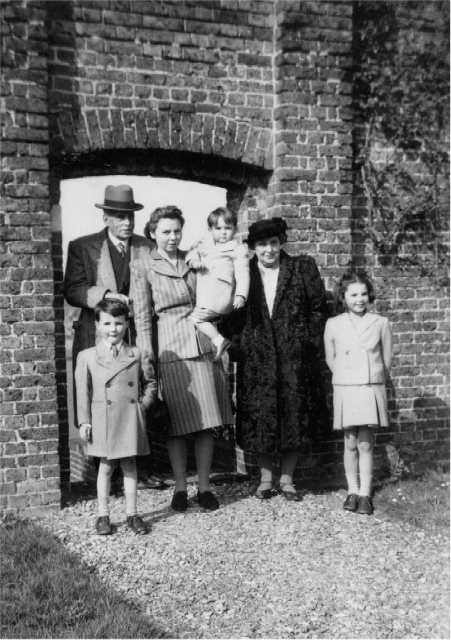Peggy and children, with Geoff's parents, in the grounds of Shirley Park Hotel, Croydon.