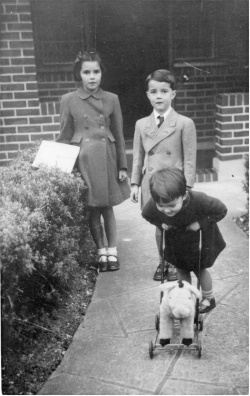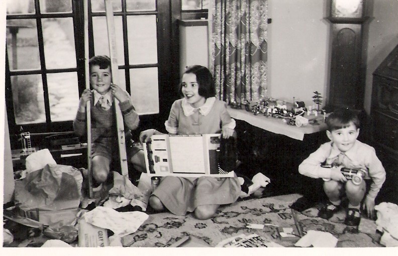 Photo sent by Geoff to Gladys entitled "Christmas 1947". The three children are smiling upon receipt of a box from Gladys in Canada filled
